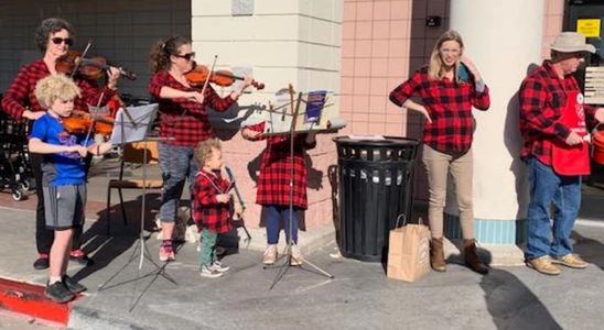 Carol & Brad Routh bring their grandkids, violins and all, to ring the bell.