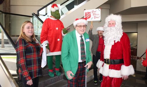 Barry Shemer & daughter ring the bell with Scrooge & Santa.